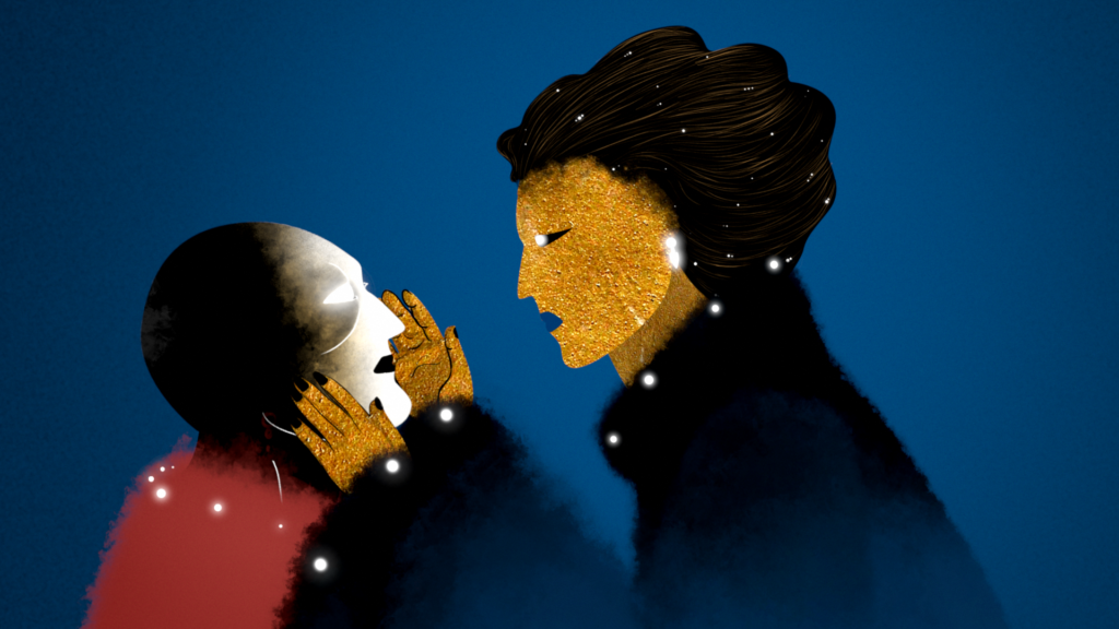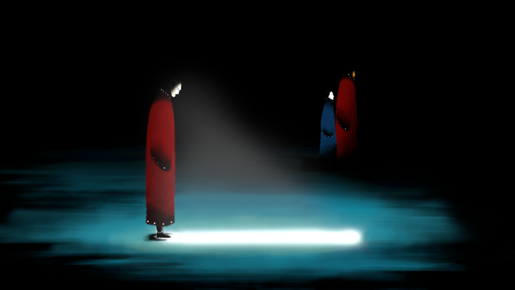 "Une petite fille s'enfante d'un corps alourdi par la mort. Une entité au visage semi-dorée prend vie auprès d'elle. Des cloches rythment le temps. Les deux êtres nés commencent alors une énigmatique catabase : descente dans des mondes aux espaces infinis. "