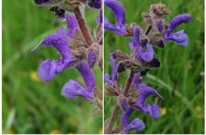 La Sauge des prés ou sauge commune attire l’attention au printemps par son abondante floraison. Pas de parfum particulier de cette sauge à la différence d’autres sauges comme la sauge officinale. Le genre des sauges est très riches en espèces, environ 900 (Flora Gallica). Les fleurs bleues de la sauge des prés sont nettement bilabiées (2 lèvres) d’où le nom donné autrefois à la famille, labiée, maintenant appelée lamiacée. Ce nouveau nom est dérivé du genre le plus représentatif de la famille, les lamiers. Les plantes de cette famille sont caractérisées aussi par des tiges de section carrée, des feuilles opposées et par des fleurs à symétrie bilatérale (fleurs zygomorphes) alors que la majorité des fleurs est à symétrie axiale (fleurs actinomorphes).