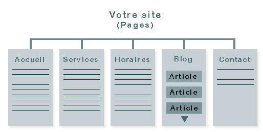 L’image ci-dessous présente la structure d’un site avec 4 pages (Accueil, Services, Horaires et Contact) ainsi qu’une page Blog qui contient 3 articles.