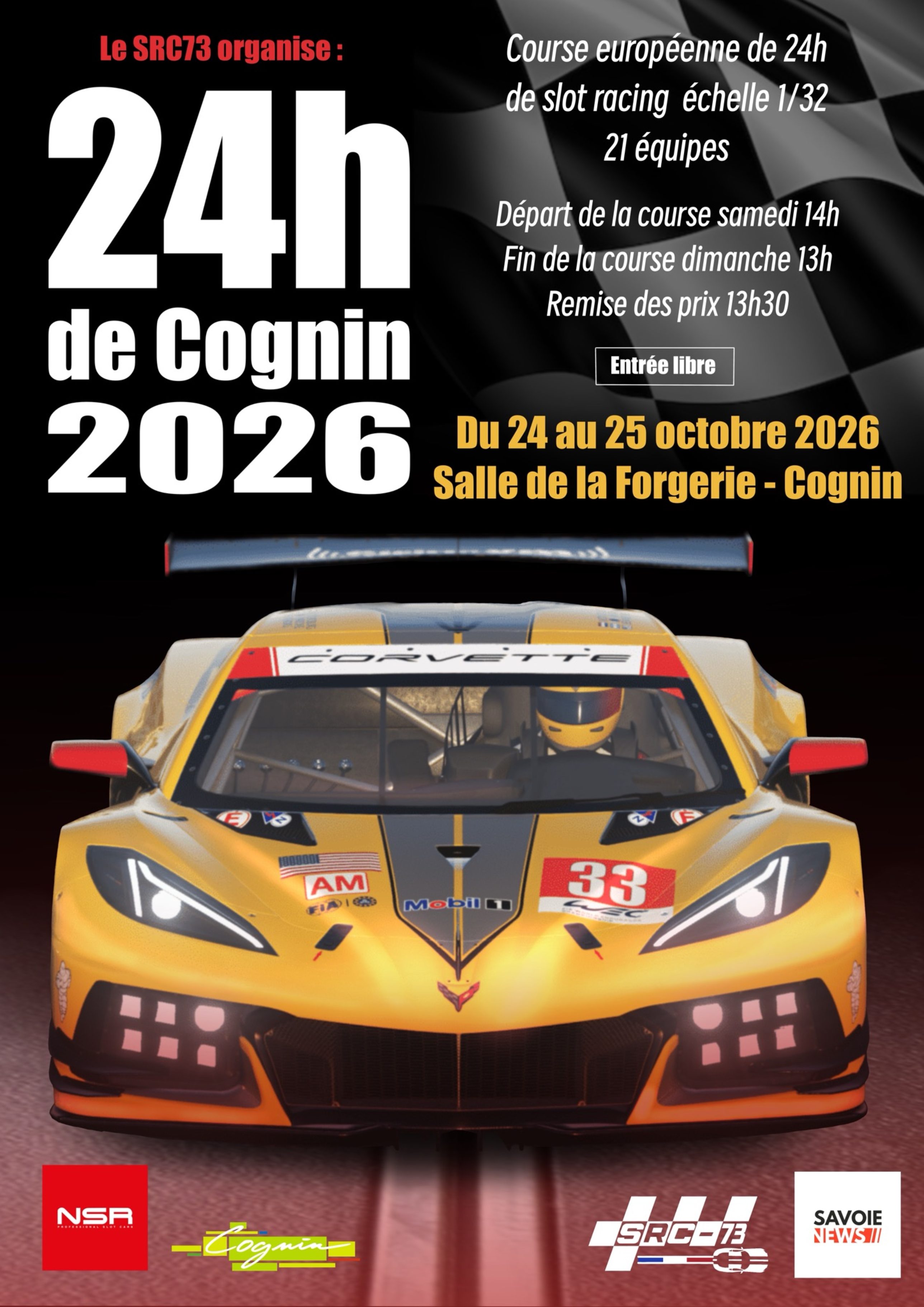 affiche 24h cognin 2026   Le rendez vous des 24 heures de Cognin 2026 est fixé du 23 au 25 Octobre 2026 Cette année nous aurons le plaisir de jouer avec les GT3 NSR (Corvette C8R, Mercedes AMG, Mc Laren 720S, Aston Matin Vantage ) 21 équipes maxi de 4 à 6 pilotes Nous monterons 3 pistes de 6 voies analogiques pour un maximum de plaisirs ! Rendez vous sur notre page dédiée  pour plus d’informations ! https://asso.alternaweb.org/slotracingcognin73/les-24-heures-de-cognin/